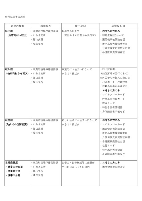双葉町に住民登録している方で住所の異動や世帯の異動がある場合は、届出が必要です。届出の際、本人確認が必要となりますので身分証明書を提示してください。
