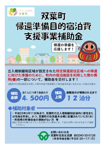 町では、立入規制緩和が実施された特定帰還居住区域への帰還準備のため、町内の宿泊施設に宿泊した際に要した費用の一部に対し、予算の範囲内で補助金(上限1人4,500円/泊)を交付します。