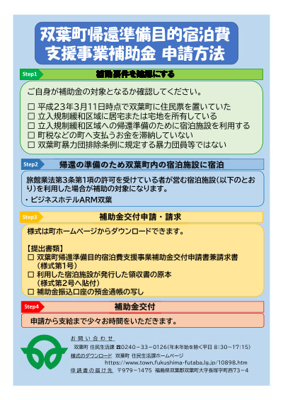双葉町内の立入規制緩和区域内に所在する居宅または宅地への帰還準備のため、対象となる宿泊施設に宿泊した際に支払った宿泊代(飲食費など宿泊基本料金に含まれない代金を除く。)