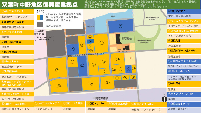 双葉町中野地区復興産業拠点では、造成・整備を進めながら順次の企業立地・事業再開を進めており、令和7年11月現在で25件と立地協定を締結しました。うち20件が中野地区での操業を開始し、地元企業の事業再開は7件となっています。