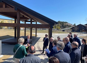 4月10日、フランス全国原子力地方情報委員会連合(ANCCLI)のジャン・クロード・ドゥラロンド委員長をはじめ、フランス国内の市町村長や地方議会議員による視察団23名が双葉町を訪問され、役場大会議室で昼食を兼ねて町から復興状況を説明し、伊澤町長と意見交換を行いました。その後、駅西住宅と町産業交流センターの視察が行われ、伊澤町長は視察団の皆さまからの質問に一つ一つ回答するとともに、町の現状について説明しました。