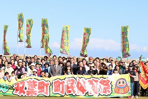 震災前に行政区対抗で行われていた「町民体育祭」は、震災後、誰もが参加できるスポーツを通じた交流を行う「ふたばスポーツフェスティバル」として継続してきましたが、今年度から「町民体育祭」として開催することとなり、前回(平成22年度)優勝した下条行政区の作本信一区長から伊澤町長に優勝旗を返還し、入場行進や「初期消火」などが形を変えて復活しました。参加者は5つのチームに分かれて、6つの種目に取り組み、笑顔があふれる楽しい時間を過ごしました。