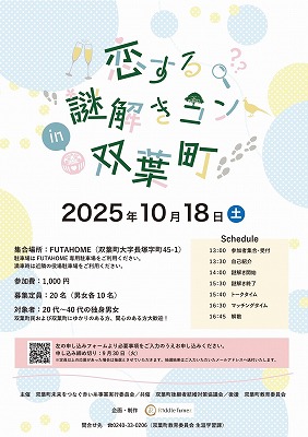 素敵な出逢いのチャンス! 双葉町未来をつなぐ赤い糸事業実行委員会が、双葉の婚活イベント「恋する謎解きコンin双葉町」を開催いたします。 今回は双葉町内で謎解き!参加者同士でコミュニケーションを取りながらクリアを目指しましょう! クリアの先には素敵な出会いが待っているかも!? 是非お気軽にご参加ください。 申込期間を10月6日(月)まで延長しました! 詳細と申込方法につきましては添付のチラシをご参照ください。