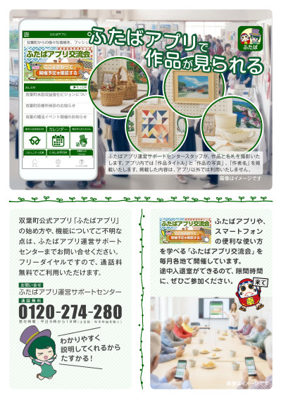 双葉町公式アプリ「ふたばアプリ」において、町民作品展覧会の作品を撮影し、アプリに掲載を予定しています。ふたばアプリの掲載可否について、申込用紙「ふたばアプリの掲載可否」にて選択いただきますようお願いいたします。