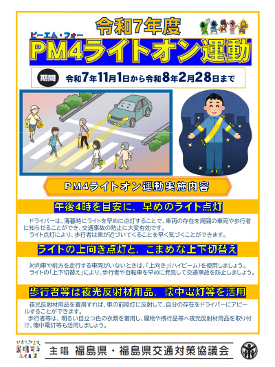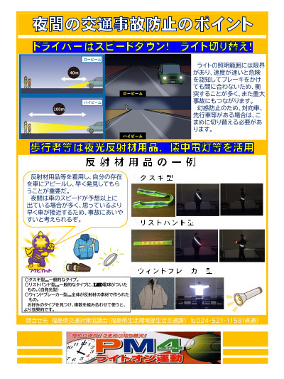 このため、下記2の期間の交通事故防止対策として、ドライバーに対して「午後4時を目安としたライトの早めの点灯」及び「対向車や先行車がいないときのライトの上向き点灯とこまめな上下切換え」による安全運転を促し、交通事故の防止を図るものです。