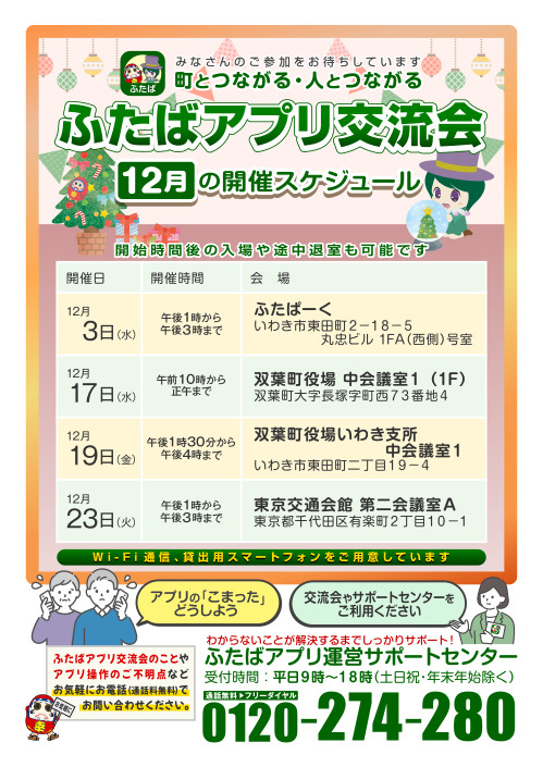 なお、下記の日程以外でもご依頼いただければ、自治会や交流グループ、各婦人学級などでもサポートを実施します。ふたばアプリ運営サポートセンター(TEL:0120-274-280)までお気軽にお問い合わせください。