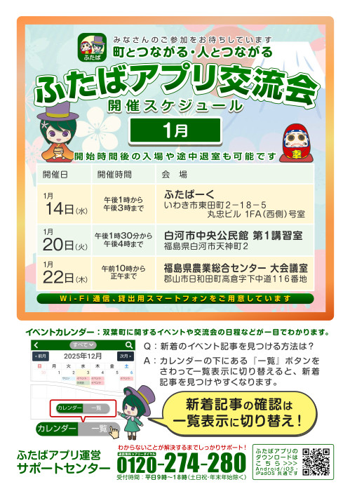 なお、下記の日程以外でもご依頼いただければ、自治会や交流グループ、各婦人学級などでもサポートを実施します。ふたばアプリ運営サポートセンター(TEL:0120-274-280)までお気軽にお問い合わせください。