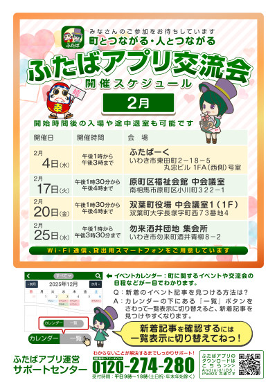 なお、下記の日程以外でもご依頼いただければ、自治会や交流グループ、各婦人学級などでもサポートを実施します。ふたばアプリ運営サポートセンター(TEL:0120-274-280)までお気軽にお問い合わせください。
