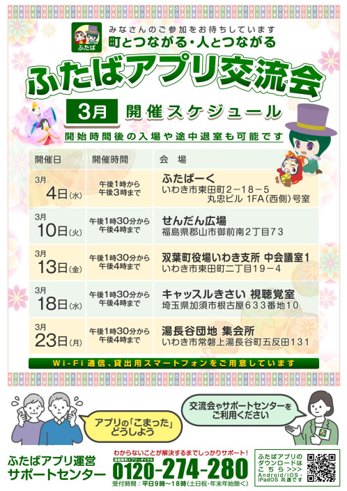 なお、下記の日程以外でもご依頼いただければ、自治会や交流グループ、各婦人学級などでもサポートを実施します。ふたばアプリ運営サポートセンター(TEL:0120-274-280)までお気軽にお問い合わせください。