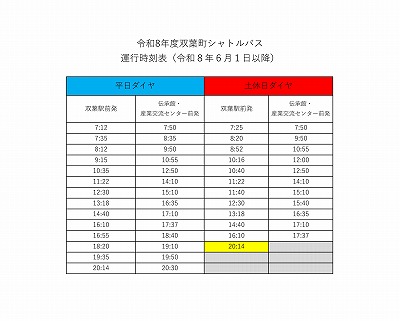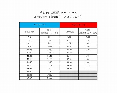 令和8年4月1日(水曜日)より、双葉町シャトルバスのダイヤが一部改正・増便されます。 4月1日(水曜日)以降の新しい時刻表は下記のとおりです。