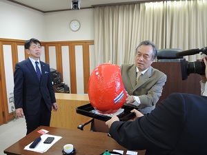 伊澤町長は「京丹波町の皆さまには震災直後から義援金や支援物資を頂戴し、今もなお継続したご支援をいただき、ようやく直接御礼が言える日がきたことを大変うれしく思います。双葉町も町の復興の具現化に向けて動き出すことができるようになりました。これまでのご支援に感謝申し上げるとともに今後ともよろしくお願い申し上げます」と御礼の言葉を述べました。